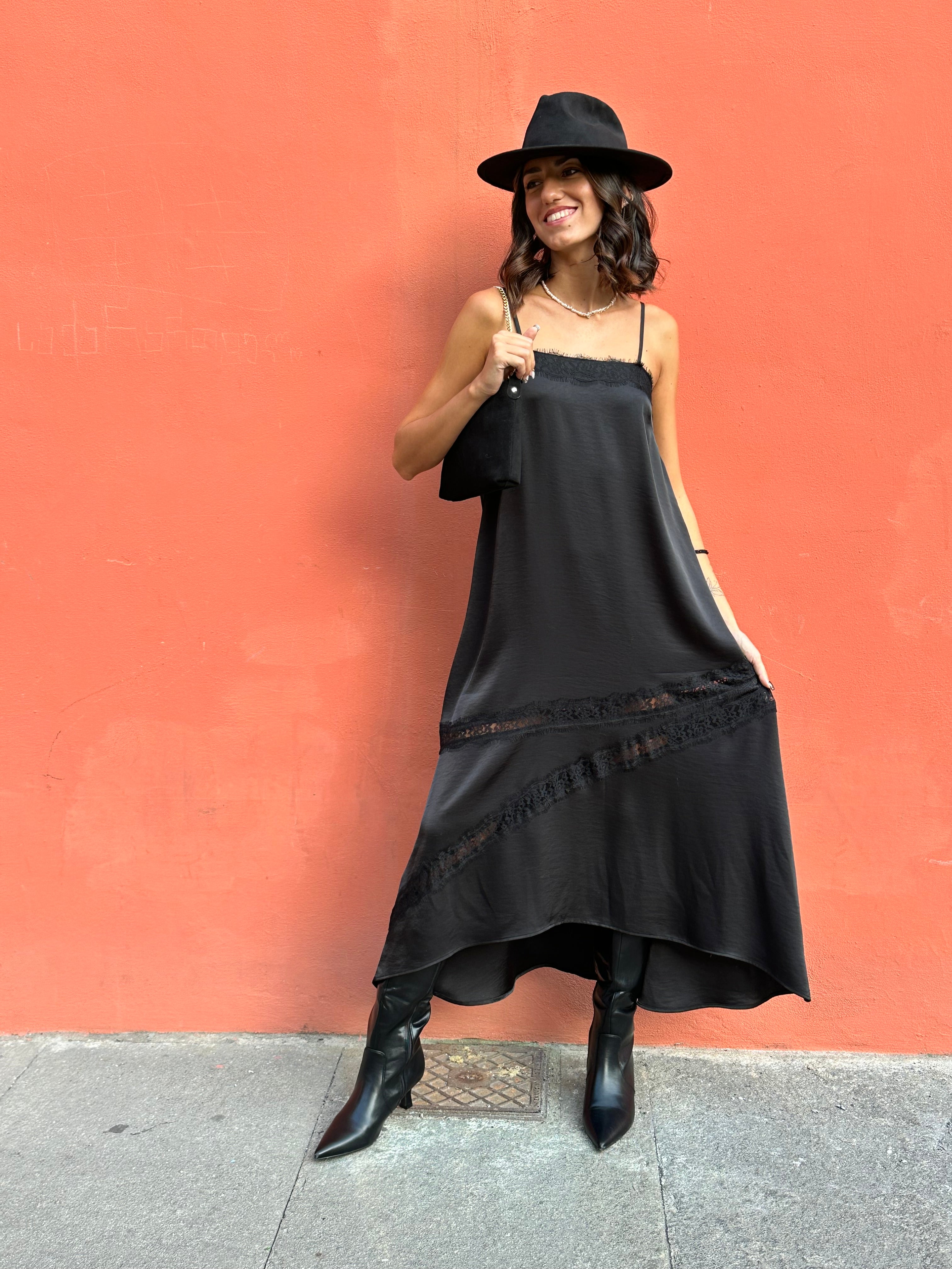 Abito lungo You Decide in raso cupro nero: eleganza senza tempo. Perfetto per ogni occasione, valorizza la tua silhouette con stile e comfort. Un capo versatile per un look sofisticato.