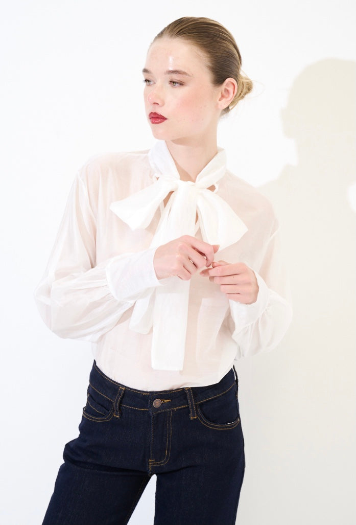 Blusa Kikisix in voile bianco con fiocco: eleganza e stile per la donna moderna. Perfetta per ogni occasione, unisce comfort e raffinatezza. Acquista ora!