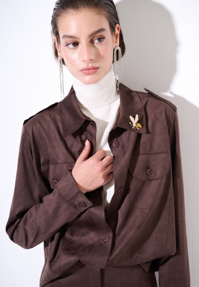 Camicia Kikisix in suede moro: eleganza e stile. Bottoni raffinati e spilla chic per un look femminile e sofisticato. Perfetta per ogni occasione.