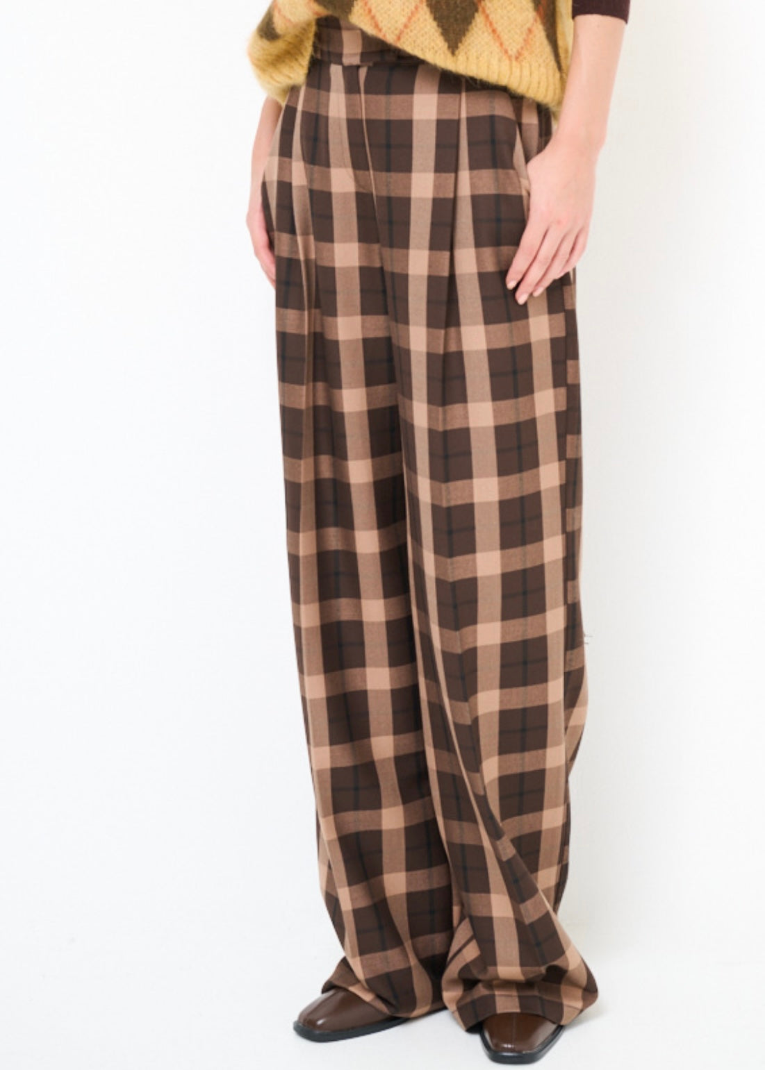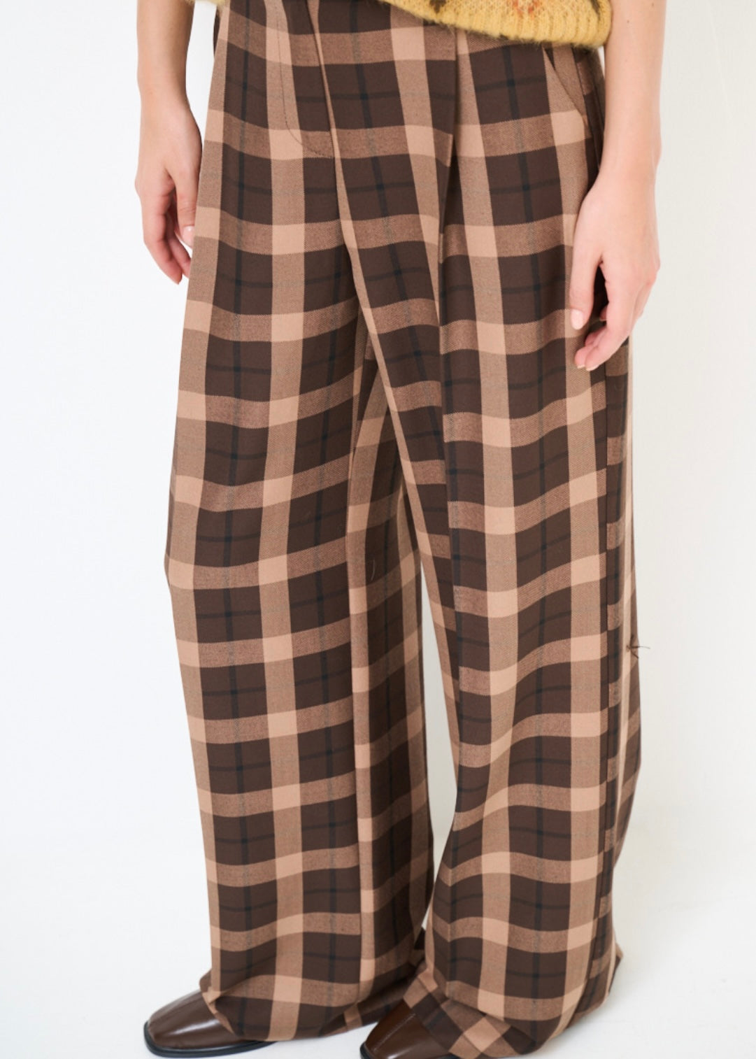 pantalone donna palazzo fantasia check a quadri marrone scuro e chiaro.Elastico in vita nella parte posteriore