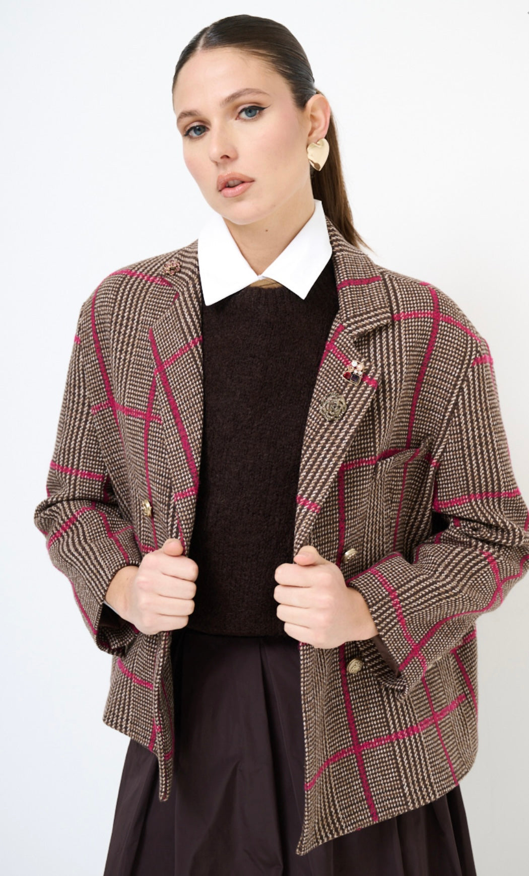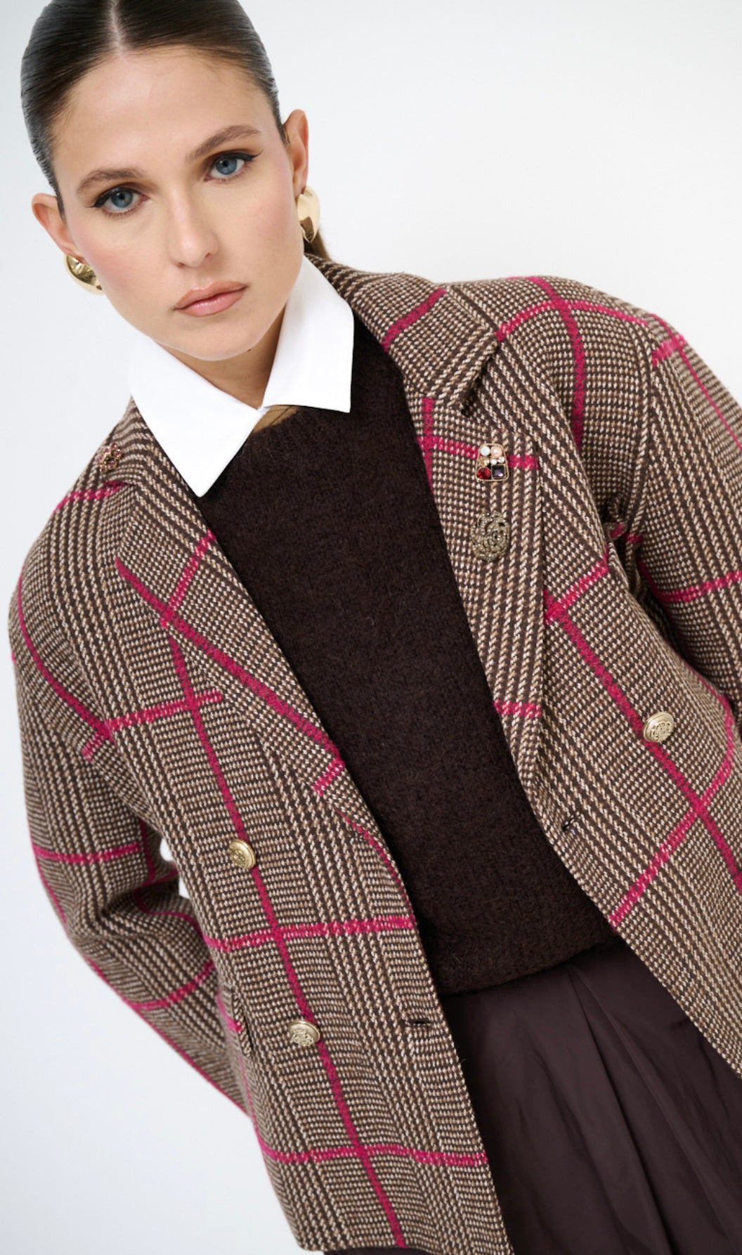 Giacca donna doppio petto modello a scatola fantasia a quadri base marrone con maxi riga fucsia
