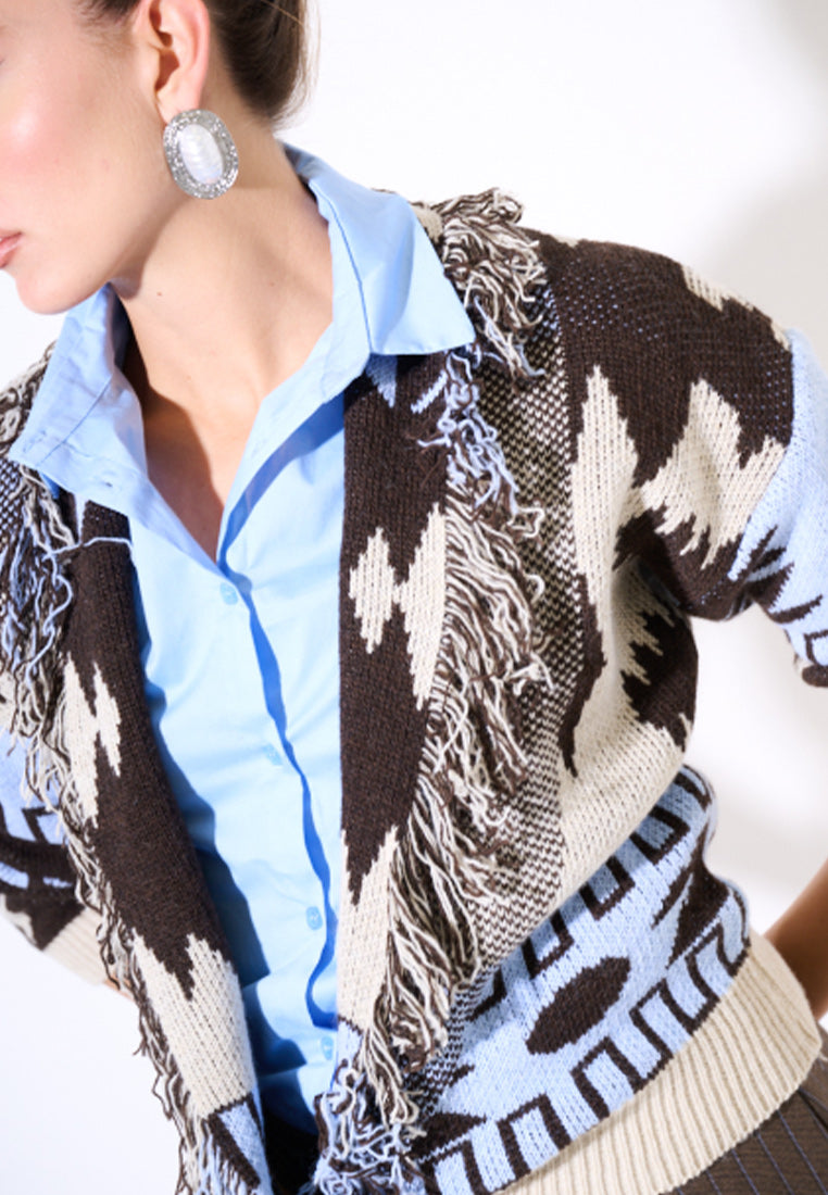 Eleva il tuo stile con il cardigan corto Kikisix da donna color panna. Il suo affascinante disegno etnico e le frange chic lo rendono perfetto per un look unico e alla moda. Ideale per ogni outfit, aggiunge un tocco di eleganza bohémien.