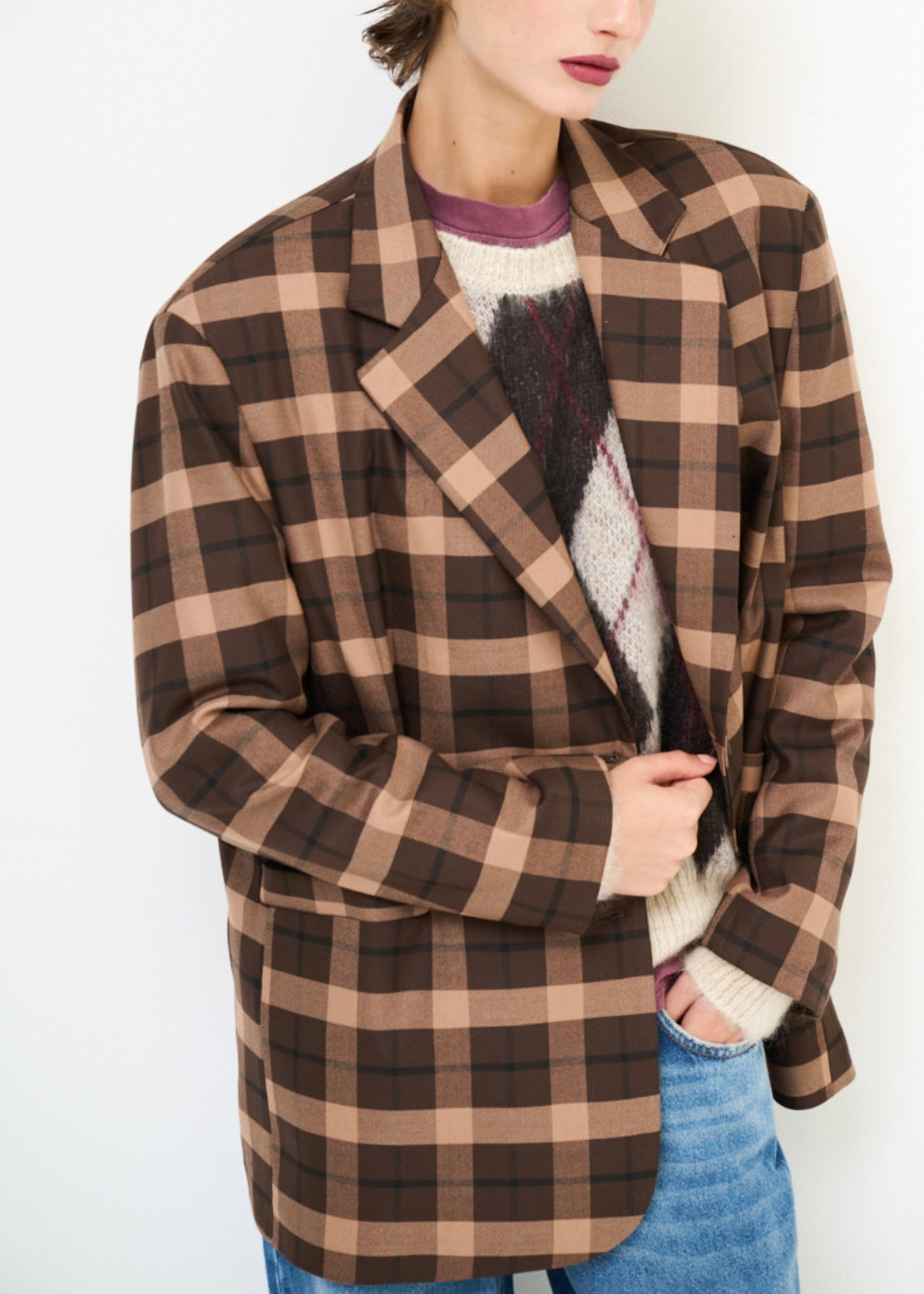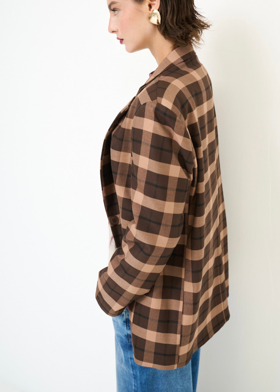 Giacca donna monopetto fantasia check a quadri marrone scuro e chiaro. Interno foderato