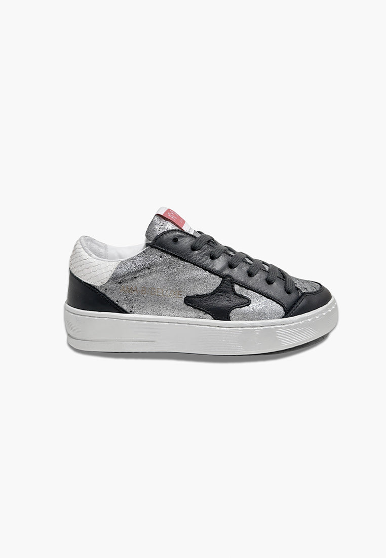 la sneakers presenta inserti in pelle nera e logo laterale nero talloncino posteriore in pelle effetto pitonato bianco e i laterali sono in pelle argentata