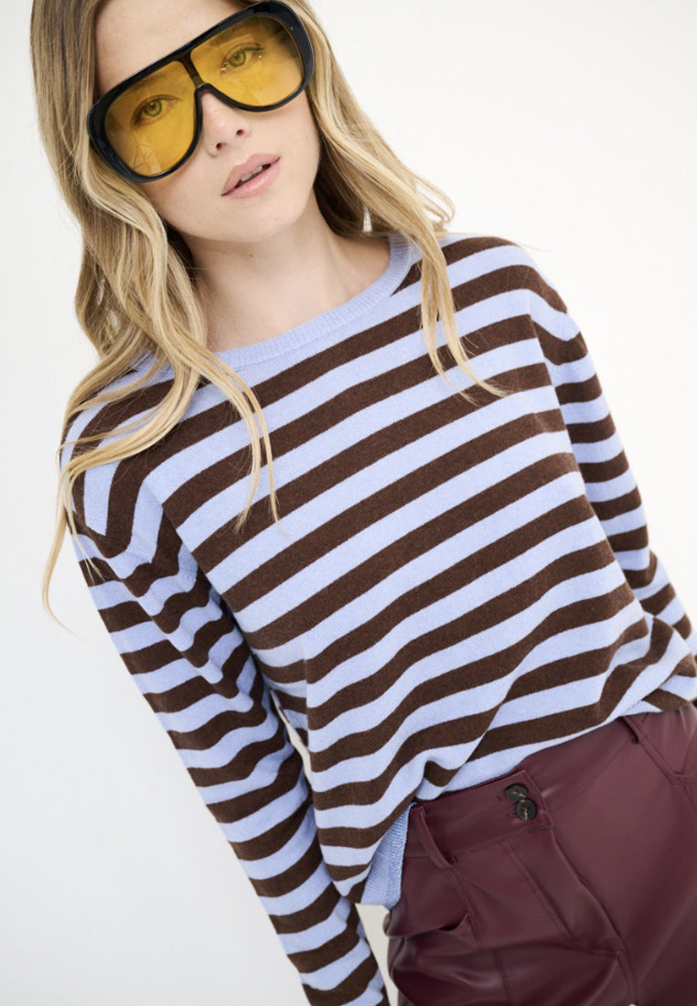 Kikisix maglia donna con bottoni, riga bicolor moro e azzurro, bordi in lurex. Eleganza e stile per ogni occasione. Perfetta per un look chic e raffinato. Acquista ora la tua maglia Kikisix!
