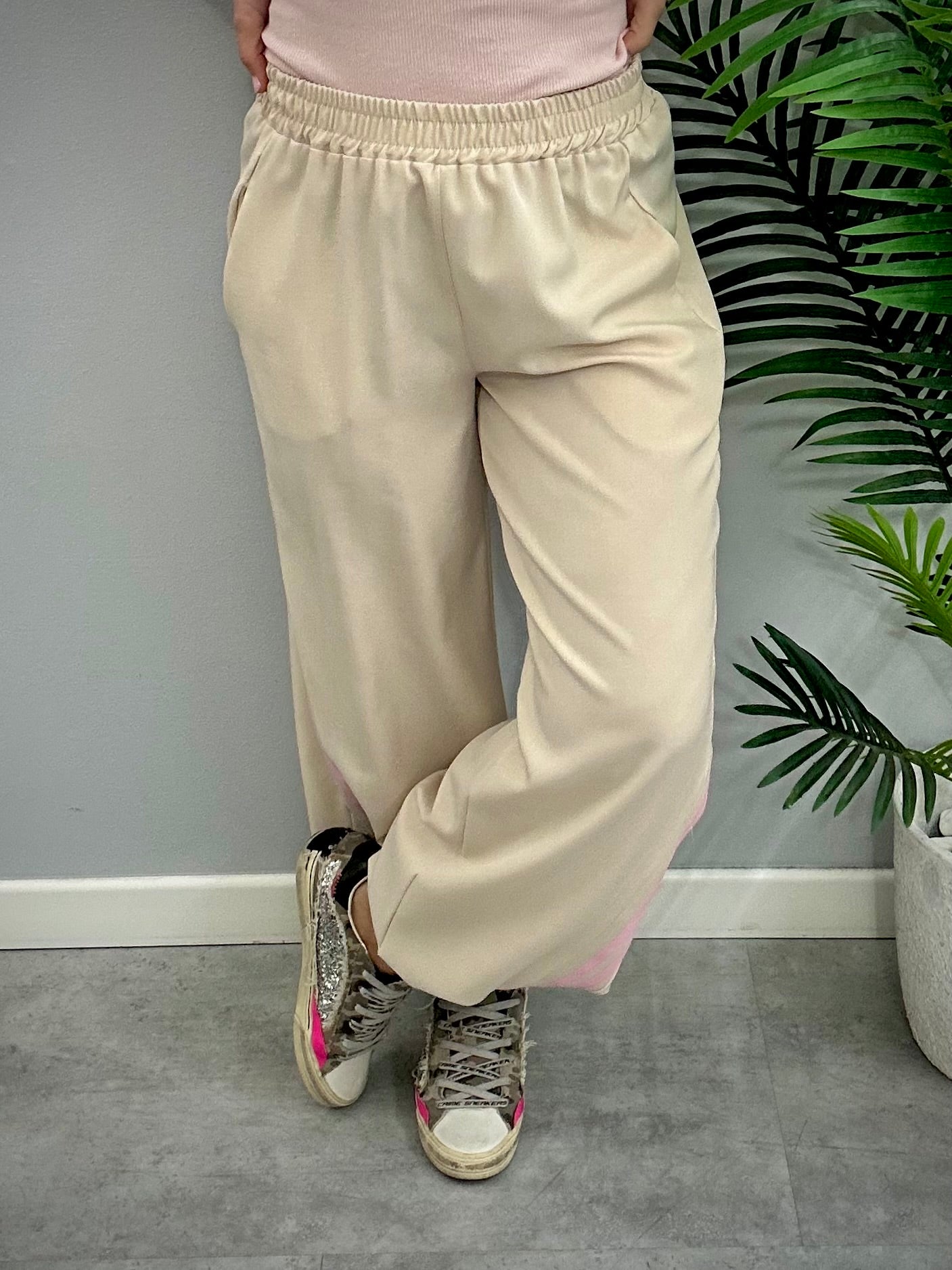 Pantalone donna Beige con bande rosa