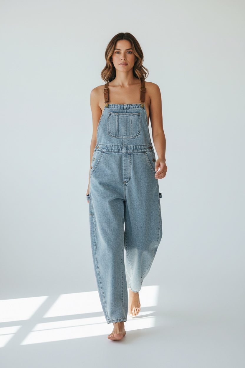 Salopette donna in denim chiaro, perfetta per uno stile casual e versatile. Realizzata in cotone di qualità, offre comfort e praticità con tasche funzionali e bretelle regolabili. Ideale per creare look moderni e rilassati, da abbinare a t-shirt, magliette o top per un'estetica contemporanea e senza tempo.