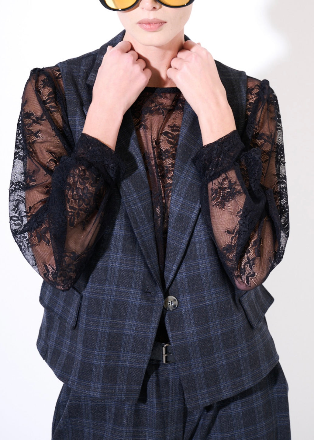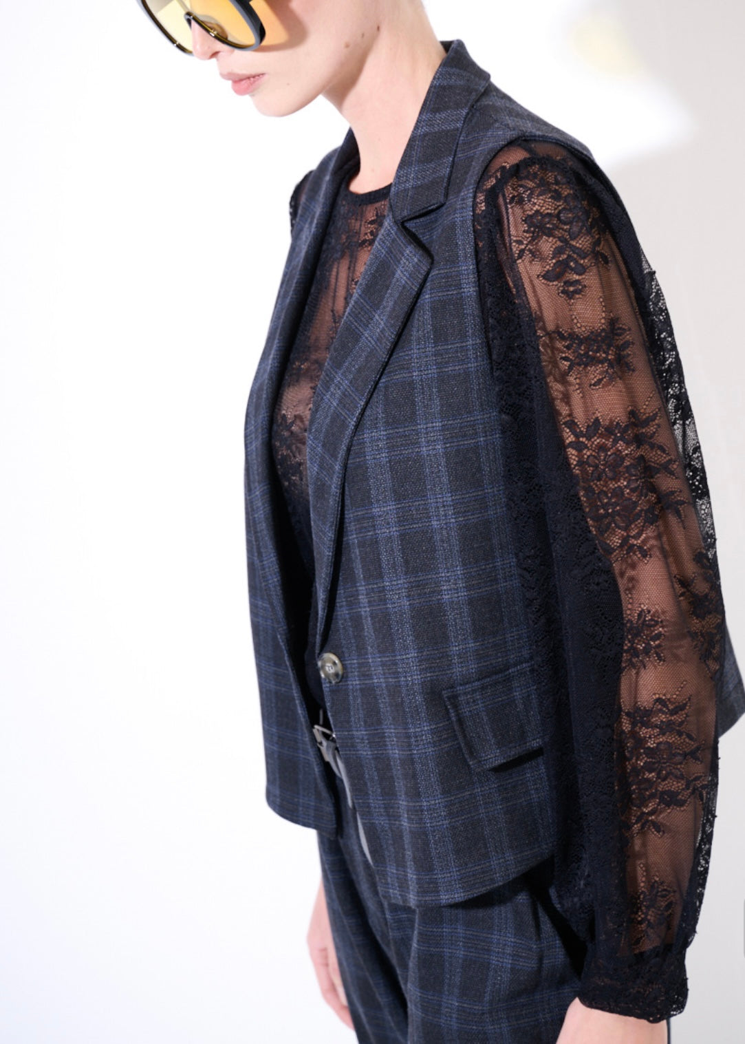 Gilet donna in tartan grigio modello con taschini frontali e bottone monopetto