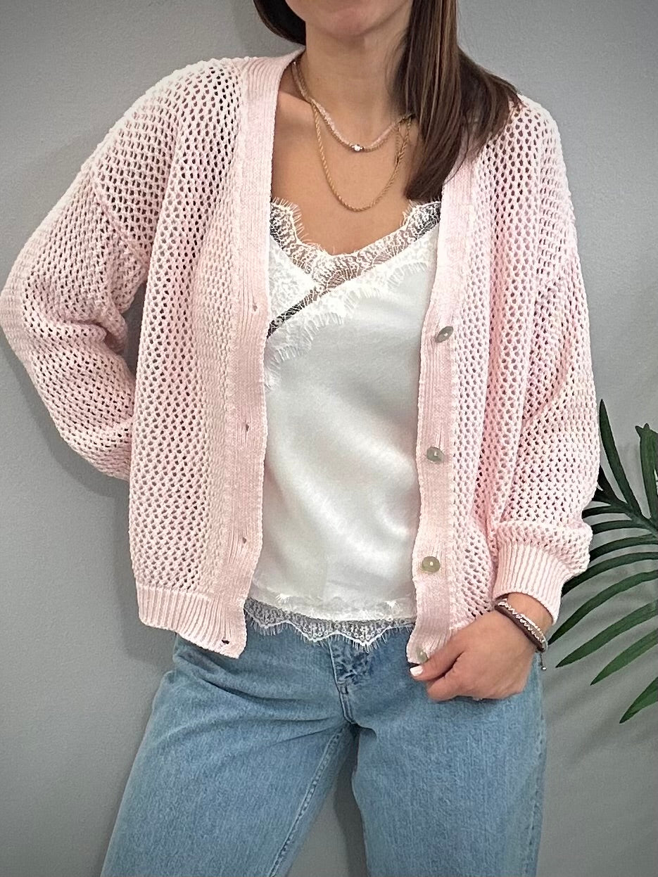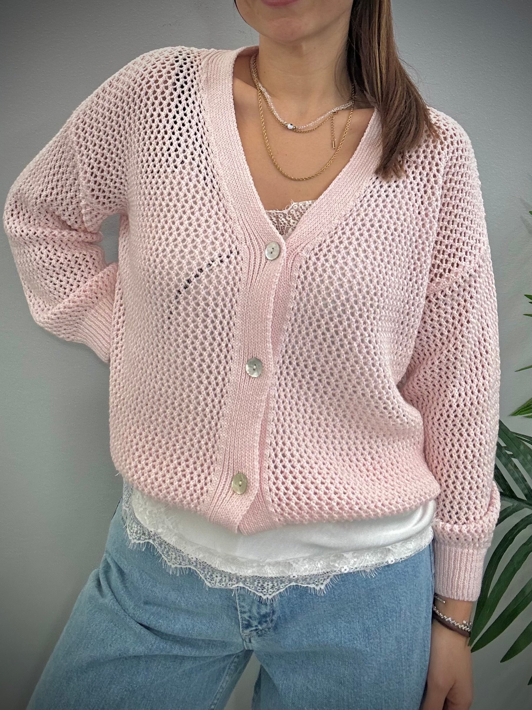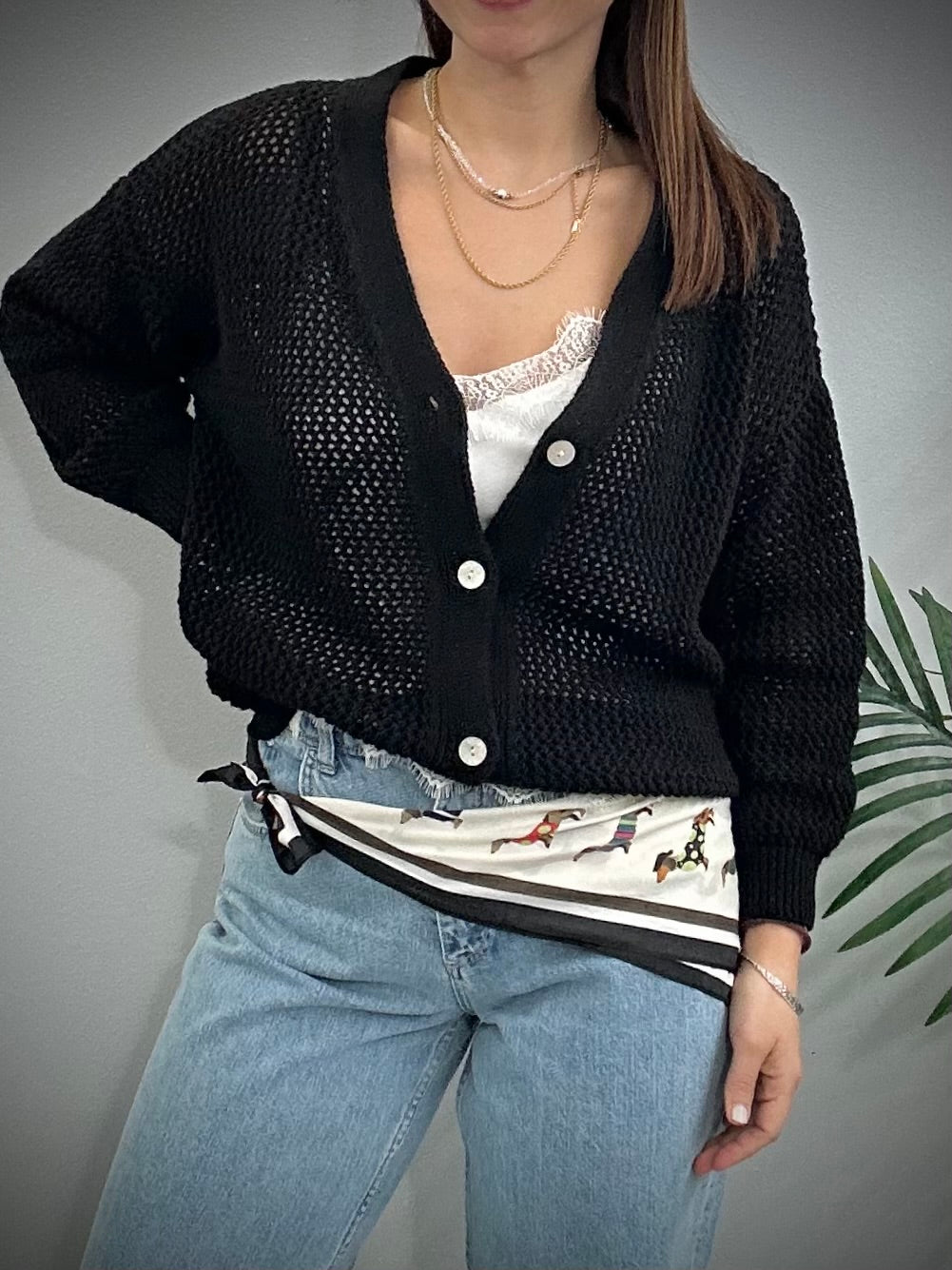 Il cardigan donna traforato è realizzato in cotone nero e rosa, combinando comfort e stile. La sua struttura traforata offre una traspirabilità ottimale, ideale per le temperature variabili. Questo capo si adatta facilmente a diversi outfit, rendendolo una scelta versatile per vari contesti.
